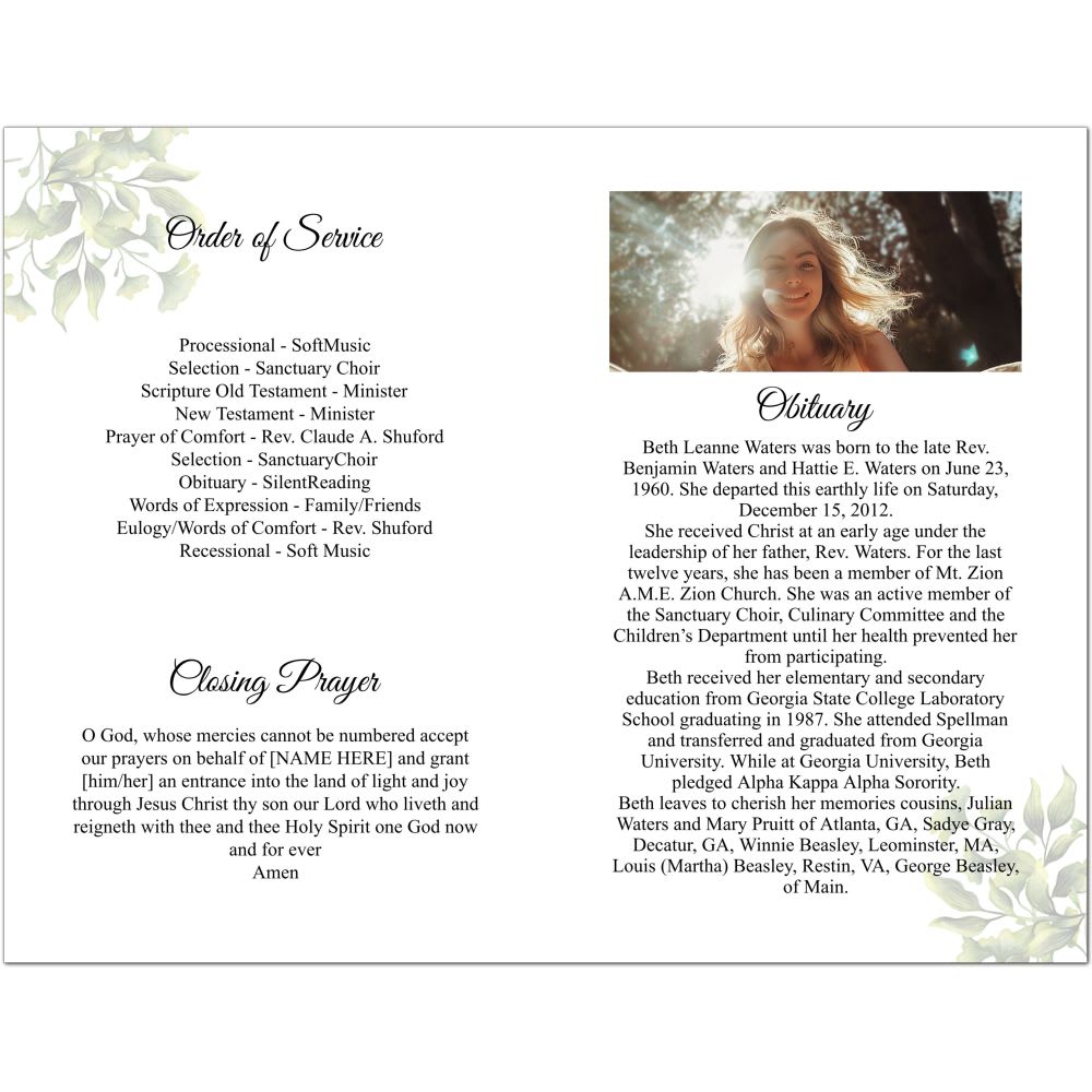 A funeral program typically includes several key components to honor the deceased and guide attendees through the service. The obituary provides a brief life summary, celebrating significant milestones and relationships. The order of service details the sequence of events, from musical selections to readings and eulogies. Expressions of thanks acknowledge those who have supported the family during their time of loss. Closing prayers offer solace and closure. Additionally, these programs often feature photos and tributes from family and friends, making each copy a heartfelt keepsake for all who attend.