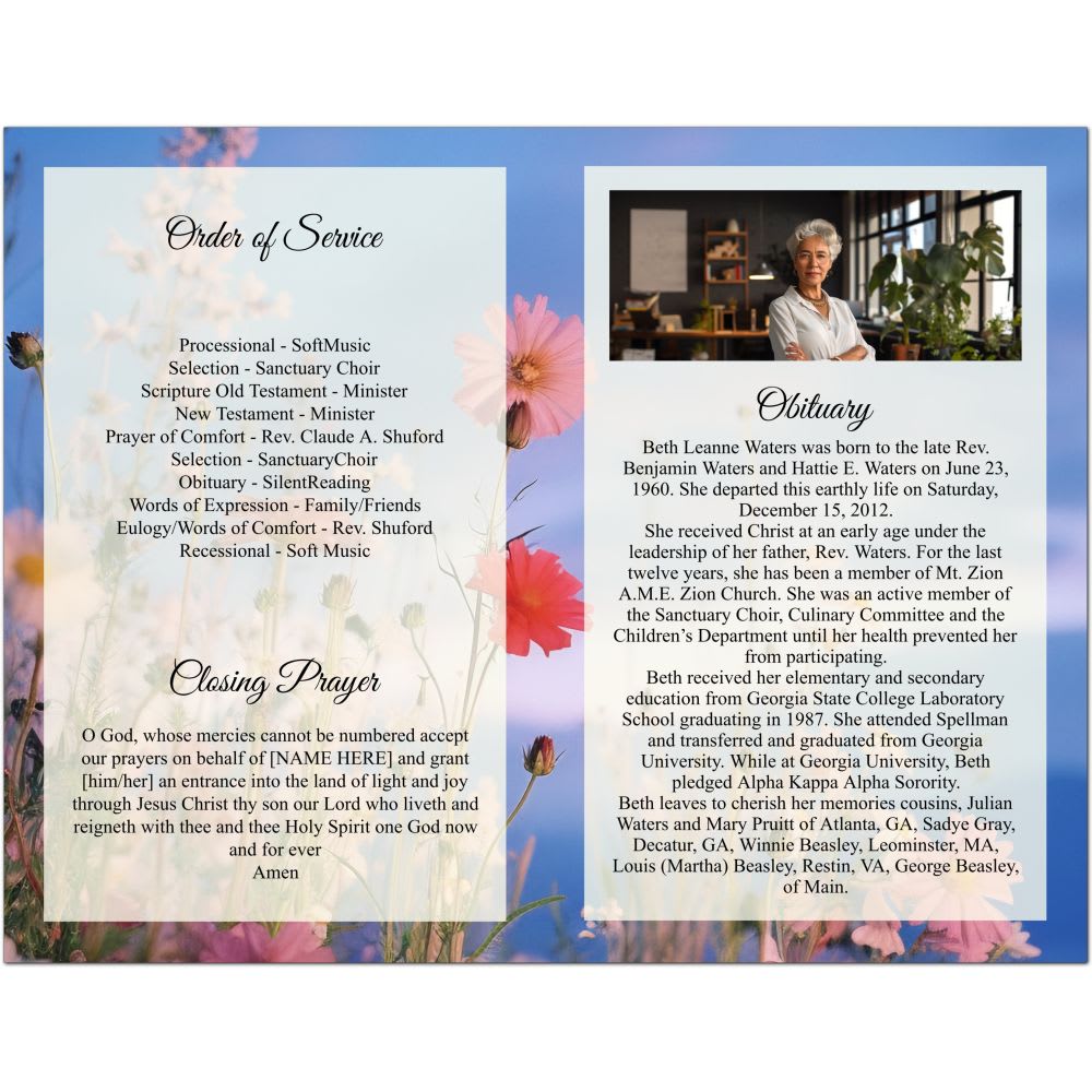 Honor your loved one with a personalized funeral program featuring a peaceful flowers and mountains background. The deceased’s photo remains gracefully placed within the scene, creating a heartfelt and elegant tribute. Perfect for memorial services, this program serves as a cherished keepsake for family and friends.