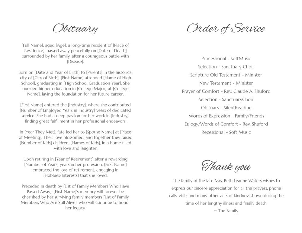 A funeral program typically includes several key components to honor the deceased and guide attendees through the service. The obituary provides a brief life summary, celebrating significant milestones and relationships. The order of service details the sequence of events, from musical selections to readings and eulogies. Expressions of thanks acknowledge those who have supported the family during their time of loss. Closing prayers offer solace and closure. Additionally, these programs often feature photos and tributes from family and friends, making each copy a heartfelt keepsake for all who attend.