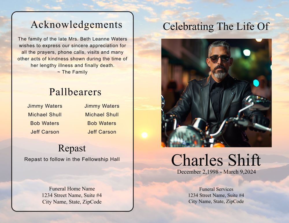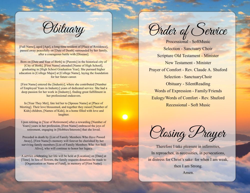 A funeral program typically includes several key components to honor the deceased and guide attendees through the service. The obituary provides a brief life summary, celebrating significant milestones and relationships. The order of service details the sequence of events, from musical selections to readings and eulogies. Expressions of thanks acknowledge those who have supported the family during their time of loss. Closing prayers offer solace and closure. Additionally, these programs often feature photos and tributes from family and friends, making each copy a heartfelt keepsake for all who attend.